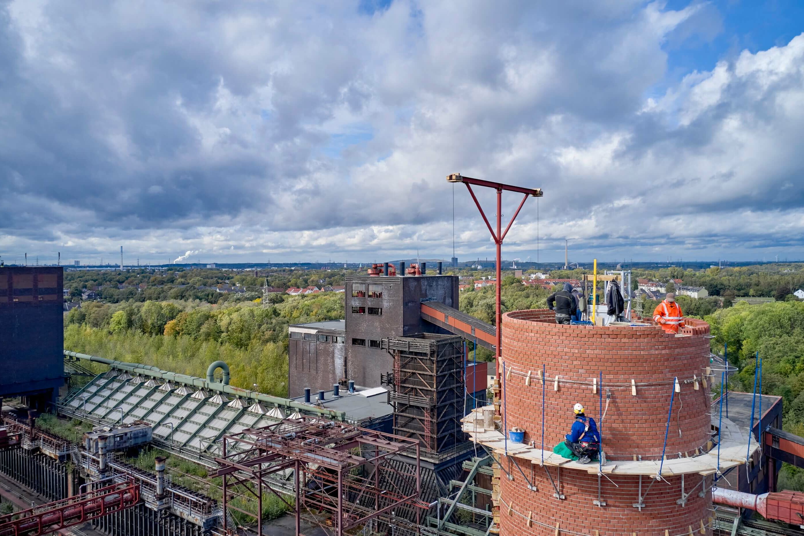 Mit einer Höhe von 80 Metern ist der Schornstein Nummer vier der Kleinste in der imposanten Sechser-Reihe der Zeche Zollverein, aber eben auch der einzige, der komplett saniert werden musste. „Bei den früheren Maßnahmen haben wir nur Teilsanierungen vornehmen müssen und auch beim S4 wollten wir zunächst nur bis auf eine Höhe von 19,20 Metern zurückbauen“, erklärt Sebastian Scholz. Je weiter sich George Mende und sein Team beim Rückbau nach unten arbeiteten, desto drastischer wurde allerdings das Schadensbild und irgendwann war offensichtlich, dass selbst Abbauhöhen von 4,00 oder 1,50 Meter keinen Sinn mehr machen und nur ein kompletter Ersatzneubau zum Ziel führen würde.